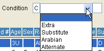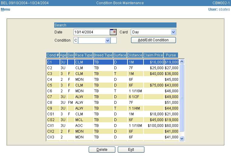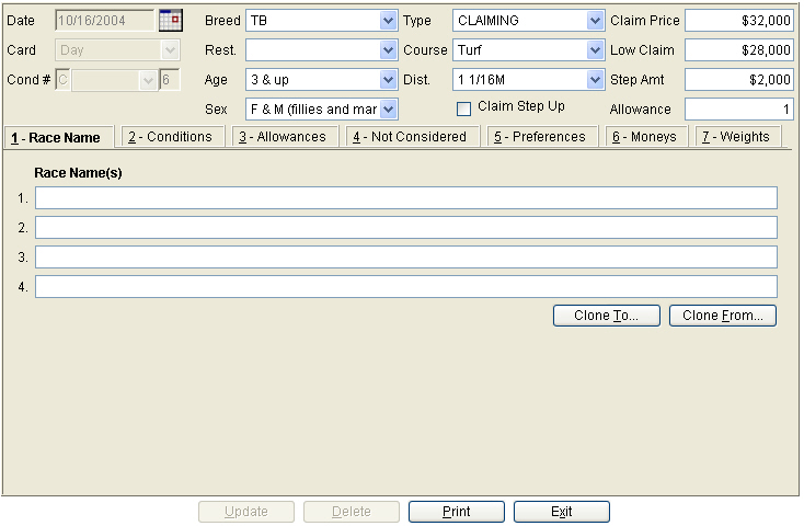 To create a regular new race, enter a race number to the far right next to the dropdown box and click on the "Add/Edit Condition" button. To write an Extra, Sub, Arabian or Alternate race, click on the down arrow in the drop down box and select the appropriate type. After the condition number and/or type has been selected, click the "Add/Edit Condition" button. The system will move into the race maintenance screen.