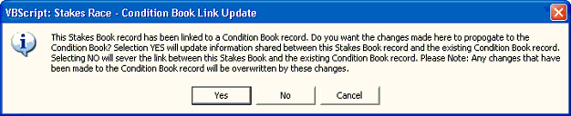 You must say YES to this message or the link to condition book will be severed. The only time you will answer No to this question is if the Stake race is being moved to another day in the condition book.