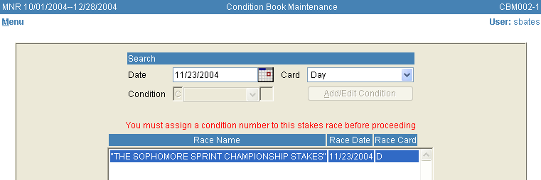 If there are multiple stake races on one day, repeat the process until all stake races have been assigned a condition number. After all stakes have been assigned, they will appear on the screen and the user will be ready to begin entering all other races.