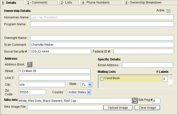 For tracks utilizing ownership registry, this enables the user to keep track of the individual accounts which make up the partnership. Enter the name of each partner in the partnership. If the ‘Owner’ button is pressed, the user can drilldown to the Horsemen Maintenance screen for that particular horsemen’s account. See example:
