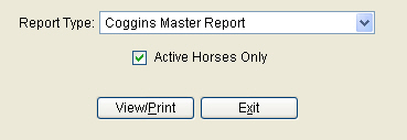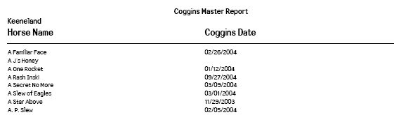 The Coggins Master report will all horses that are in the track’s inventory. There is also an option to include only horses that are marked as active. Horses are listed in alphabetical order with the coggins date.