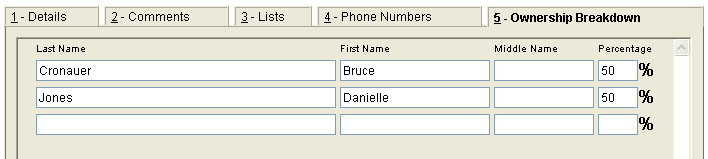 This is primarily used by So. Cal. tracks to track the individual owners in each partnership account. Pretty basic, this is just free form text for last name, first name and middle name. % can be entered as well.